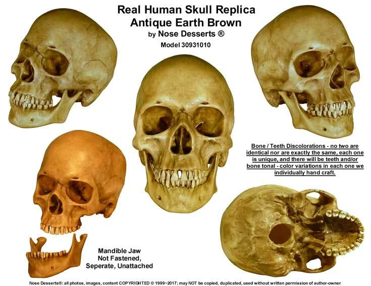· Human Skull Replica Aged Relic “Earth-Tone Brown” - Life Size Reproduction "Cranium is intact – One Piece Cranium and is NOT SPLIT"; Suture, Cranial, Nasal Cavities & Jaw are accurately reproduced.