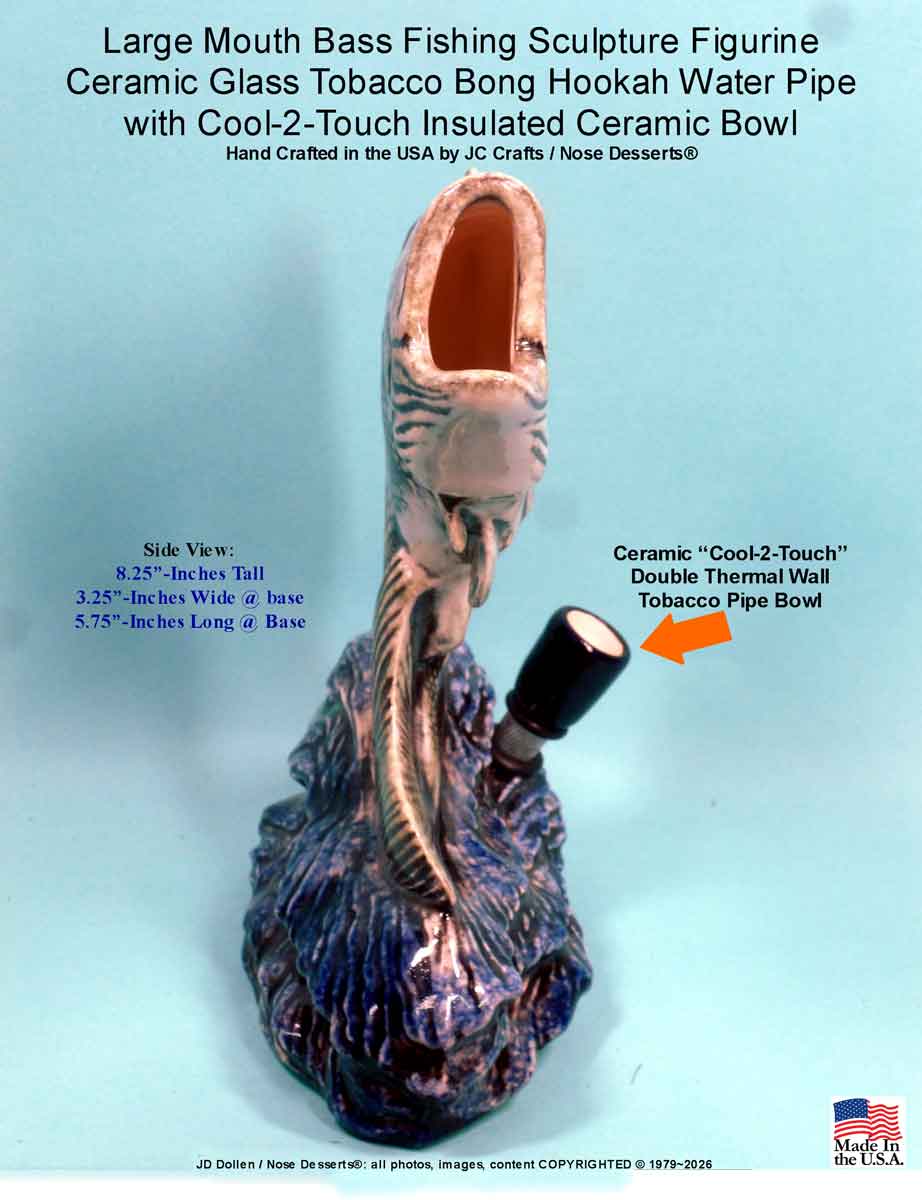 Hand Made in the USA by JC Crafts & Nose Desserts® Brand; model #0883 Hand held 8.5-inches Tall, Hand made, hand painted Multi-Colors Glazed Gloss Ceramic Glass modern Hookah Type Tobacco Pipe with our “Cool-2-Touch” Insulated Thermal Walled Tobacco Bowl. This Hand held Water Tobacco Pipe is ergonomically contoured to comfortably fit your hand, it is completely hollow inside, will not get hot to the touch, and it is designed to be light weight and very sturdy for everyday uses. To be used as a Tobacco Pipe, simply place tobacco or any legal smoking material within the ‘Cool-2-Touch’™ bowl-depression area and the smoking stem mouth-hole is located at the top of the ceramic figurine.
